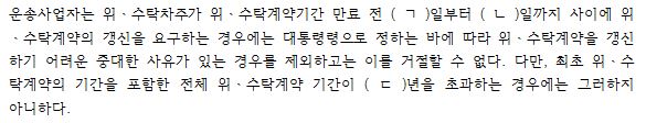 문제 45. 화물자동차 운수사업법상 위수탁계약의 갱신 등에 관한 조문의 일부이다. ( )에 들어갈 숫자를 바르게 나열한 것은?