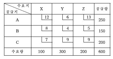 문제 11. 3개의 공급지와 3개의 수요지를 지닌 수송문제를 보겔추정법을 적용하여 해결하려고 한다. 총운송비용과 공급지 B에서 수요지 Z까지의 운송량은? (단,공급지와 수요지간 톤당 단위운송비용은 셀의 우측 상단에 표시됨)(단위: 천원, 톤)