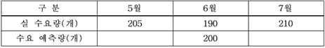 문제 34. ‘갑’회사의 3개월간 판매실적 정보와 6월의 수요 예측량은 아래 표와 같다. 3개월간 이동평균법(A)과 단순지수평활법(B)을 이용하여 계산한 ‘갑’회사의 8월의 수요 예측량(개)은? (단, 평활상수( )는 0.3, 답은 소수점 첫째자리에서 반올림한다.)