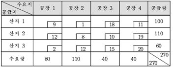 문제 15. 3개 산지의 원재료 공급량이 각각 100, 110, 60이고, 4개 공장의 원재료 수요량이 각각 80, 110, 40, 40인 운송계획이 있다. 산지에서 공장까지의 운송비는 운송표 각 칸의 우측하단에 제시되어 있다. 최소비용법으로 초기해를 구하면 최소 총 운송비용은? (단위: 원, 톤)