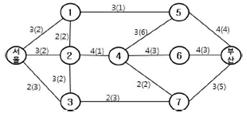 문제 11. 서울에서 부산까지 화물운송을 위한 최대 운송가능량 및 운송비가 아래와 같이 주어질 경우, 최소비용운송계획법(Least Cost Flow Problem)에 따른 서울에서 부산까지의 최소 총 운송비용은? (단, 각 경로에 표시된 숫자는 구간별 최대 운송가능량, ( )는 해당 경로의 단위당 운송비임)