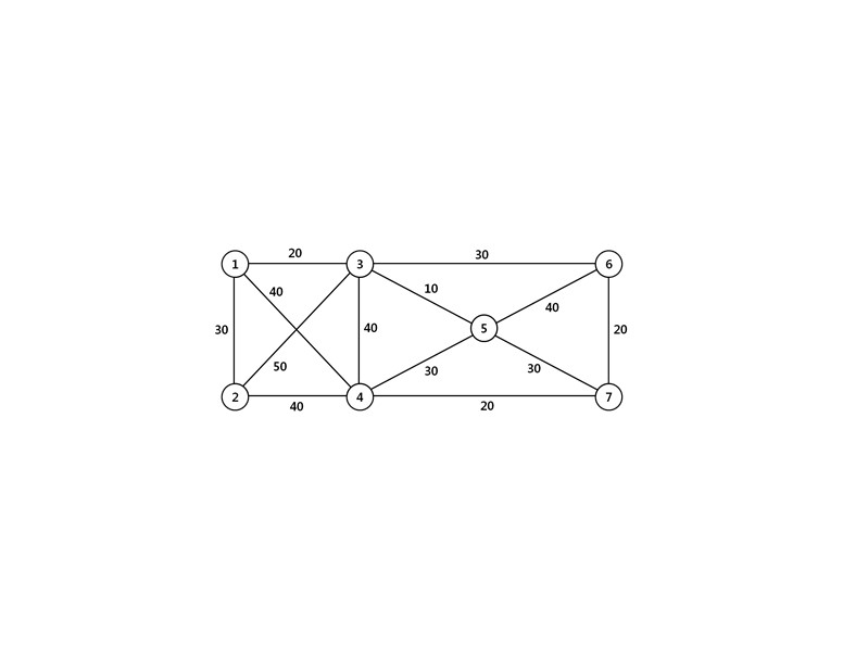 문제 14. 다음 네트워크에서 7지점의 물류 창고를 모두 연결하는 도로를 개설하려 한다. 최소로 필요한 도로 연장은? (단, 각 구간별 숫자는 거리(km)를 나타냄)
