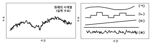 문제 39. 시계열 예측기법은 수요를 평균(혹은 수평), 추세, 계절, 주기, 우연변동 등의 요소로 분해할 수 있다. 다음의 시계열 자료를 분해할 때, ㄱ~ㄹ에 적합한 내용을 순서대로 옳게 나열한 것은?