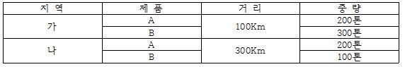 문제 4. C물류기업의 물류비 계산을 위한 자료이다. 제품 A와 제품 B의 운송비 비율은? (단, 운송비 배부기준은 거리 x 중량을 사용함)