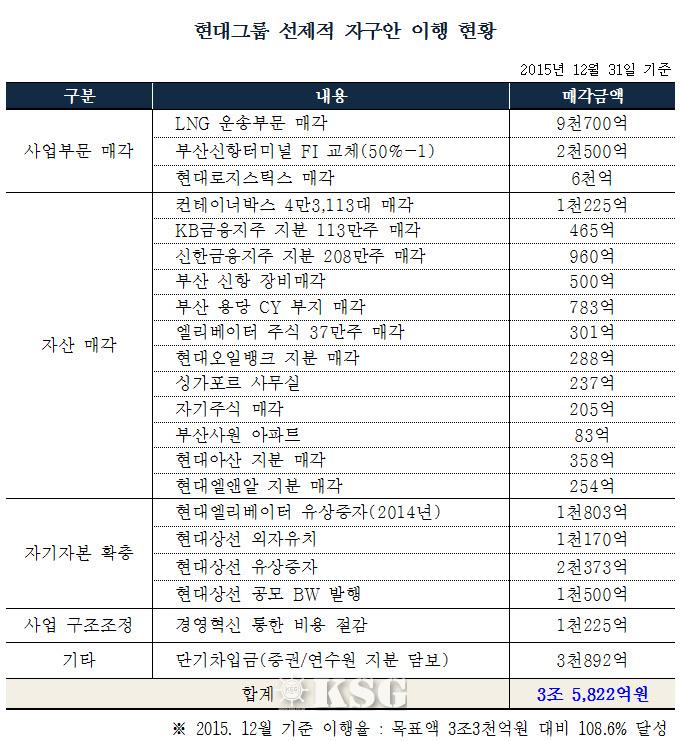 현대그룹측은 “지난 2013년 12월에 마련한 3조 3천억원 규모의 유동성 확보를 골자로 한 선제적 자구안을 발표한 후 2년여 만에 목표치 대부분을 이행했지만 좀처럼 살아나지 않는 해운업황 등으로 인해 기존 자구안만으로는 유동성 위기를 해소할 수 없다고 보고 추가 자구안을 마련해 산업은행 등 채권단과의 협의를 거쳐 추진방안을 확정했다”고 밝혔다.