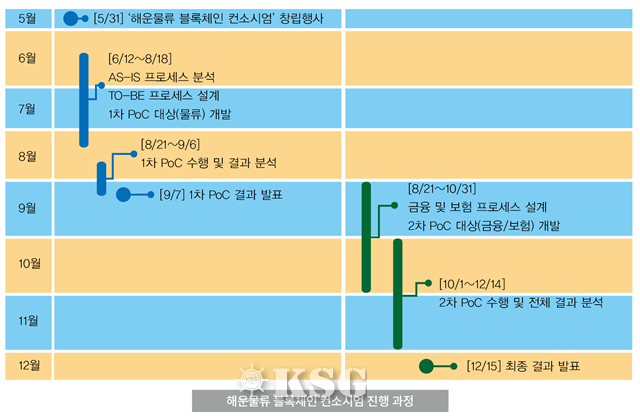 국내 최초로 결성된 해운물류 블록체인 컨소시엄이 개념증명(Proof of Concept, POC) 진행현황을 공개했다. 블록체인은 네트워크상에서 참여자들의 신뢰를 통해 거래를 검증하고 암호화해 분산된 원장에 보관함으로써 투명성과 보안성을 확보할 수 있는 기술이다.