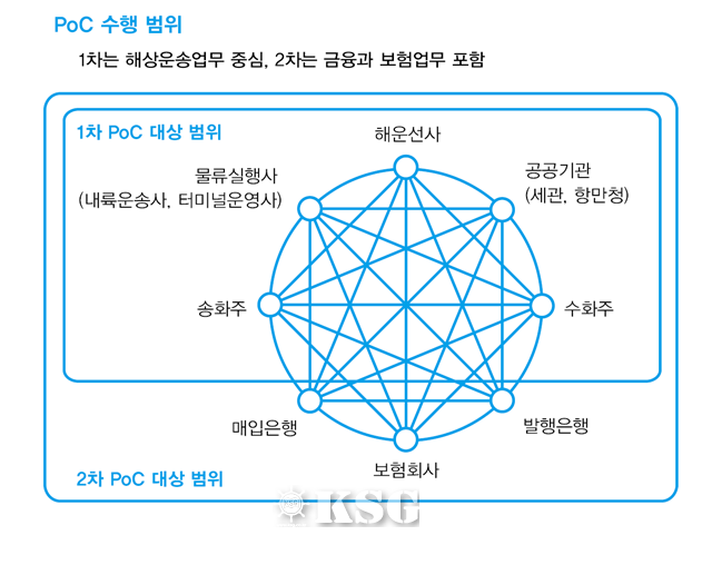 1차 PoC는 부산항에서 중국 청도, 대련항으로 향하는 현대상선과 남성해운의 수출 물량을 대상으로 블록체인 기술을 적용했다. 2차 PoC는 금융과 보험업무를 포함해 태국 베트남 인도 두바이 유럽으로 확대할 예정이다. 2차 PoC 대상 범위는 ▲해운선사 ▲공공기관(세관, 항만청 등) ▲물류실행사(터미널운영사 등) ▲송화주 ▲수화주 ▲매입은행 ▲보험회사 ▲발행은행으로 확대된다.