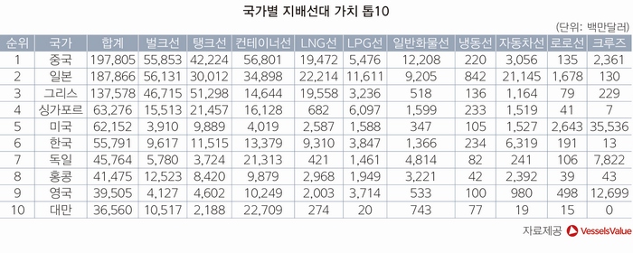 지배선대 가치 1위 국가는 1978억달러를 기록한 중국이다. 중국은 1년 새 21%나 선단 가치를 늘리면서 일본을 제치고 1위에 올라섰다. 이어 2위 일본은 1878억달러, 3위 그리스는 1375억달러로, 각각 13% 6%의 가격 상승을 거뒀다.