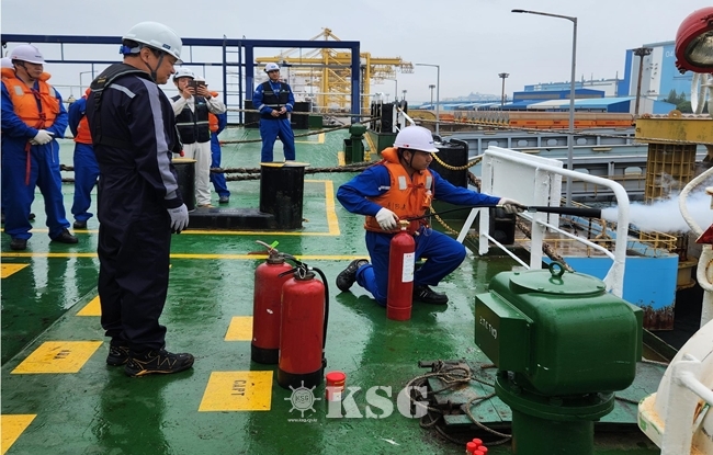훈련에 참가한 선원들은 비상상황을 가정해 ▲구명조끼 착용 ▲선박 탈출을 위한 구명뗏목 팽창 ▲조난신호탄 발사 ▲화재진화를 위한 소화기 분사 등을 직접 실시했다.