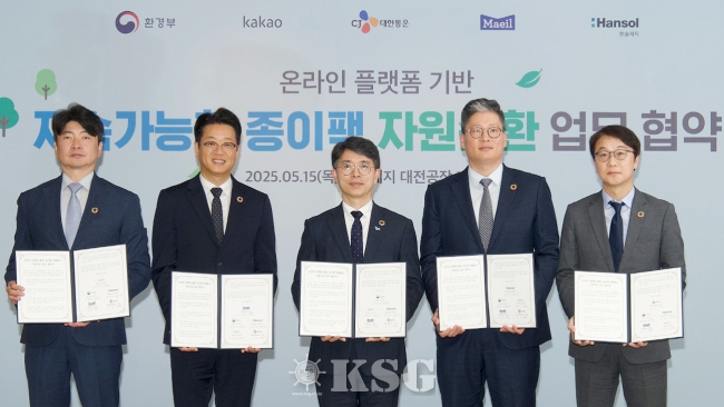 CJ대한통운은 15일 한솔제지 대전 공장에서 환경부 주관으로 ‘온라인 플랫폼 활용 종이팩 택배 회수 시범사업’ 업무협약을 체결했다고 밝혔다. 협약식에는 환경부 김완섭 장관을 비롯해 CJ대한통운 윤진 한국사업부문 대표, 카카오 우영규 대외협력 성과리더, 매일유업 고정수 부사장, 한솔제지 한경록 대표이사가 참석했다.