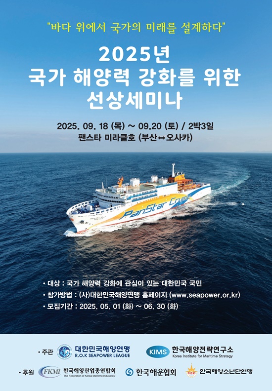 대한민국해양연맹과 한국해양전략연구소가 주최하고 한국해양산업총연합회와 한국해운협회, 해양소년단연맹이 후원하는 ‘국가해양력 강화를 위한 선상 세미나’가 오는 9월18일부터 20일까지 2박3일 간의 일정으로 열린다.