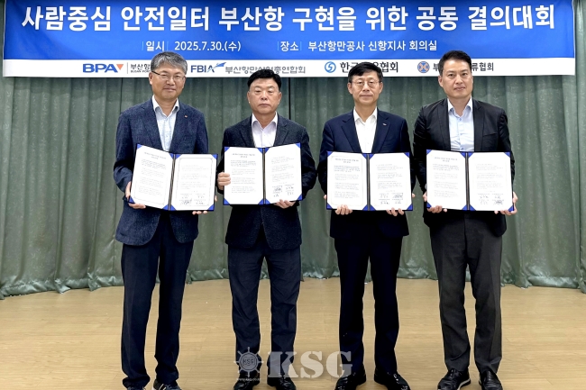 사진 오른쪽에서 2번째)이 결의문에 직접 서명했다. 부두 운영사 대표들도 현장에 배석해 안전 확보를 위한 공동 의지를 함께했다.