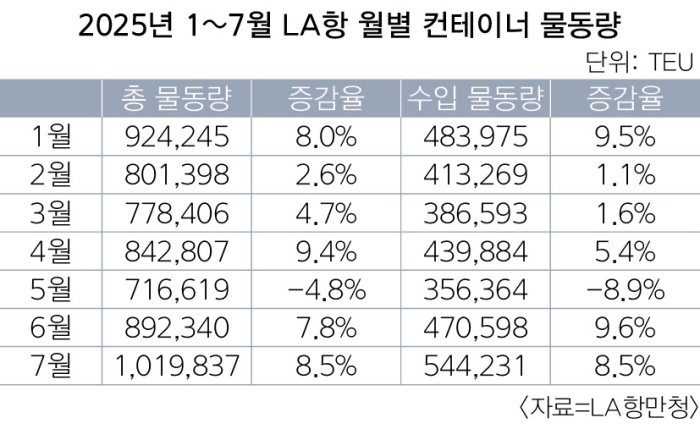 LA항은 5월에 유일하게 물동량이 9% 줄었다. LA항만청은 트럼프 행정부의 관세 영향으로 5월 물동량은 둔화됐으며, 이후 무역 협정이 유예된 6~7월 연말 화물을 미리 반입하려는 추세가 나타났다고 설명했다.