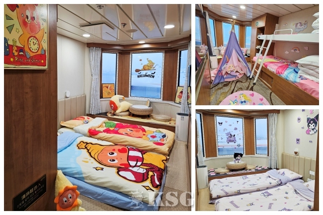 이 배의 객실은 단순히 잠만 자는 곳이 아니었다. 죽 늘어선 방문 사이사이에 캐릭터 상품으로 꾸며진 객실들이 보였다. 최근 유행하는 산리오 캐릭터들과 라부부, 작은별 등 아이들이 좋아할 만한 캐릭터 테마로 다양하게 꾸며진 침실들을 보니 웃음이 나왔다.