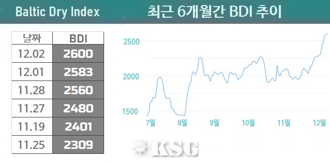 벌크선시장은 파나막스선을 제외한 선형에서 상승세가 지속됐다. 연말을 앞두고 철광석 재고 구축이 활발하게 진행되면서 케이프선은 강세가 이어졌다. 12월2일 건화물선 운임지수(BDI)는 전주보다 93포인트 상승한 2600으로 발표됐다. 한국해양진흥공사가 공표한 한국형 건화물선 운임지수(KDCI)는 2만4273으로 마감됐다.