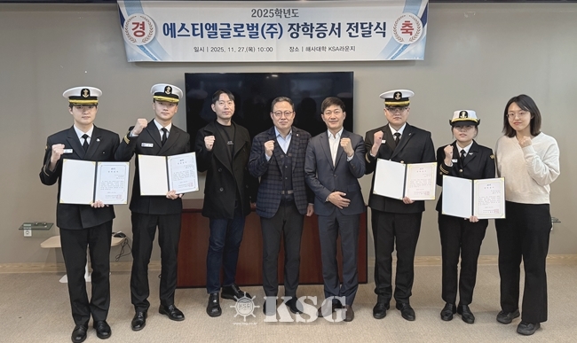 지난 11월27일 한국해양대 해사대학관 KSA라운지에서 열린 ‘장학증서 전달식’엔 에스티엘글로벌 김종수 이사, 해사대학 김종수 학장, 기관시스템공학부 강준 학부장 등이 참석해 장학생 5명에게 장학증서를 직접 전달했다.