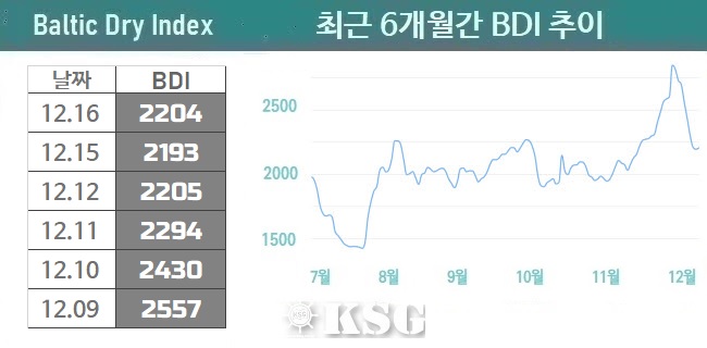 벌크선시장은 모든 선형에서 물동량 유입이 둔화되면서 약세를 기록했다. 12월16일 건화물선 운임지수(BDI)는 2204로 발표됐다. 한국해양진흥공사가 공표한 한국형 건화물선 운임지수(KDCI)는 2만327로 마감됐다.