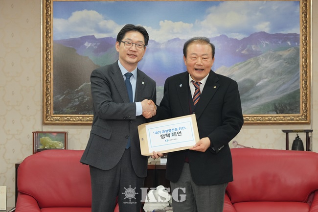 | ▲양재생 회장(사진 오른쪽)이 김경수 위원장에게 국가 균형발전을 위한 정책 제언을 전달한 뒤 기념사진을 촬영하고 있다.