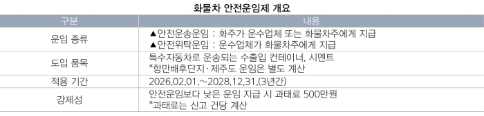 올해 화물자동차 안전운임이 확정됐다. 국토교통부는 1월30일 화물자동차 운수사업법 시행령에 따라 수출입 컨테이너와 시멘트 품목의 안전운임을 공표하고 2월1일부터 시행한다고 밝혔다. 안전운임은 화주 또는 운수업체가 화물차주에게 지급해야 하는 최저요금으로, 3년 일몰제로 운영된다.