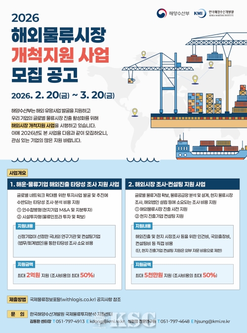 해양수산부는 물류기업의 해외 진출을 지원하는 ‘2026 해외물류시장 개척지원 사업’ 공모를 2월20일부터 3월20일까지 진행한다.