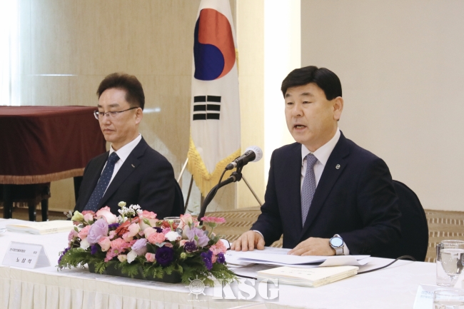 | ▲노삼석 한국항만물류협회 회장이 사업 현안을 설명하고 있다. |