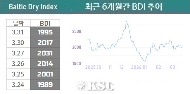 3월 마지막 주 벌크선 시장은 상승과 하락이 반복되는 널뛰기 시황을 연출했다. 중동 지역의 지정학적 위기가 고조되고 선형 간 물동량 이관이 계속되는 등 혼조세가 지속됐다. 3월31일 건화물선 운임지수(BDI)는 1995로 발표됐다. 한국해양진흥공사가 공표한 한국형 건화물선 운임지수(KDCI)는 1만9616로 마감됐다.