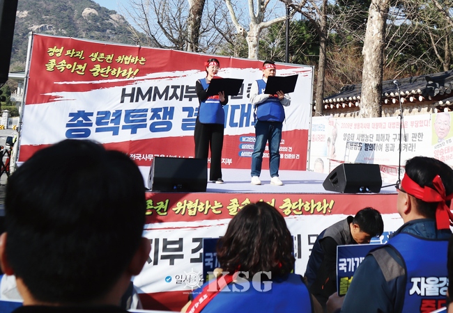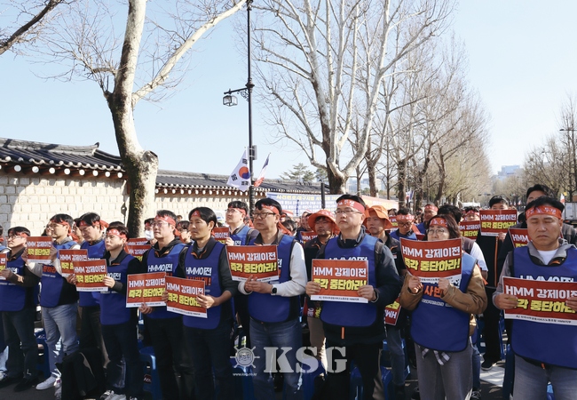 HMM 육상노동조합은 지난 2일 서울 청와대 앞에서 ‘조합원 총회 및 총력 투쟁 결의대회’를 열고 사측의 일방적인 본사 이전을 저지하기 위한 총파업도 불사하겠다는 강경 투쟁 의지를 담은 공동 보도자료와 결의문을 발표했다.