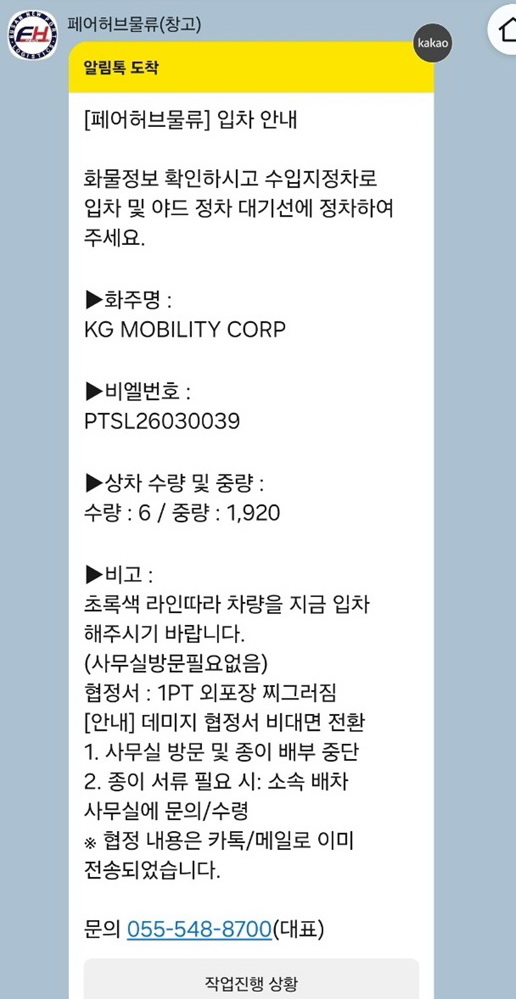 | ▲‘페어허브물류 입차 안내’ 알림 메시지 화면 |
