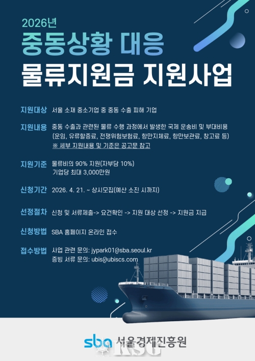 서울경제진흥원(SBA)은 중동 사태로 물류 차질을 겪는 서울시 중소 수출기업을 대상으로 기업별 최대 3000만원의 물류비를 지원하는 ‘2026년 중동 상황 대응 물류지원금 지원사업’을 추진하고 4월21일부터 상시 모집에 들어갔다고 밝혔다.