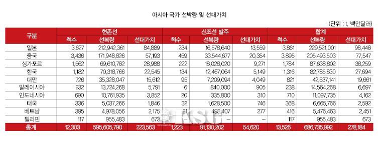 우리나라가 선복량으로는 아시아 3위에 올라 있지만 선대가치로는 4번째 수준인 것으로 파악됐다. 신조선까지 포함할 경우 우리나라는 선복량에서도 4위에 머무는 것으로 나타났다.