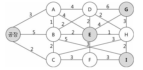 문제 12. 운송회사는 공장에서 물류창고 E, G, I까지 각각 1대씩의 화물차량을 배정하려고 한다. 최단거리로 운송할 경우에 합산한 총운송거리는? (단, 링크의 숫
