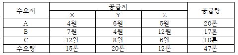 문제 12. 3개의 수요지와 공급지가 있는 운송문제에서 최소비용법(Least-cost Method)을 적용하여 산출한 최초 가능해의 총운송비용은? (단, 공급지와 수요지 간 비용은 톤당 단위운송비용임)