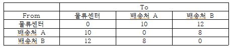 문제 14. 물류센터에서 배송처 A와 B를 순회 배송하는 방법(물류센터 → 배송처 A → 배송처 B → 물류센터)과 배송처 A와 B를 개별 배송하는 방법(물류센터 →배송처 A → 물류센터, 물류센터 → 배송처 B → 물류센터) 간의 운송거리 차이는?(단위 : km)