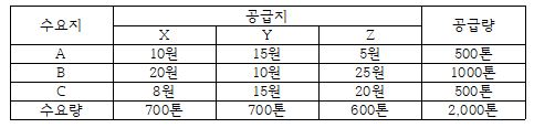 문제 16. 화물을 공급지 A, B, C에서 수요지 X, Y, Z까지 운송하려고 할 때 북서코너법에 의한 총운송비용은? (단, 공급지와 수요지 간 비용은 톤당 단위운송비용임)