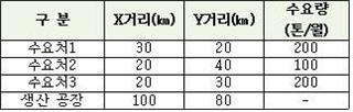 문제 36. 수요처 및 생산공장의 위치좌표와 수요량이 다음 표와 같을 때, 무게중심법에 따라 유통센터의 입지를 산출한 좌표(X, Y)로 옳은 것은?
