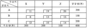 문제 12. 수요지와 공급지 간의 비용이 아래와 같이 제시될 경우, 최소비용법(Least-Cost Method)과 보겔추정법(Vogel's Approximation Method)을 이용한 초기해 산출 값에 관한 설명으로 옳은 것은?(단위: 원/톤, 공급지에서수요지까지의 운송비는 운송표 각 칸의 우측 하단에 제시되어 있음)