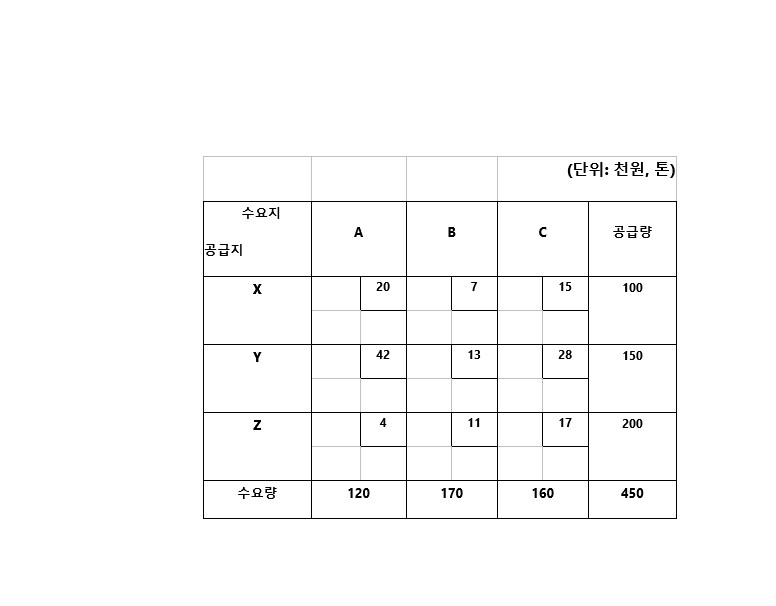 문제 11. 북서코너법(north-west corner method)과 보겔추정법(Vogel's approximation method)을 적용하여 총운송비용을 구할 때 각각의 방식에 따라 산출된 총운송비용의 차이는? (단, 공급지에서 수요지까지의 톤당 운송비는 각 셀의 우측 상단에 제시되어 있음)