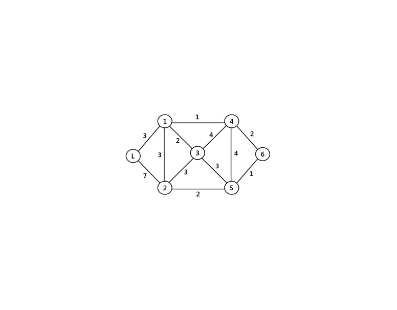 문제 16. 배송센터 L로부터 모든 수요지점 1~6까지의 최단 경로 네트워크를 구성하였을 때, 구성된 네트워크의 전체 거리는? (단, 각 구간별 숫자는 거리(km)를 나타냄)