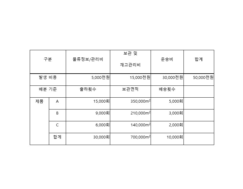 문제 35. 다음은 작년 K사 물류거점시설의 제품별 주요 물류비 배분 내역이며 총 물류비는 50,000천원이었다. 제품 C의 물류비는?
