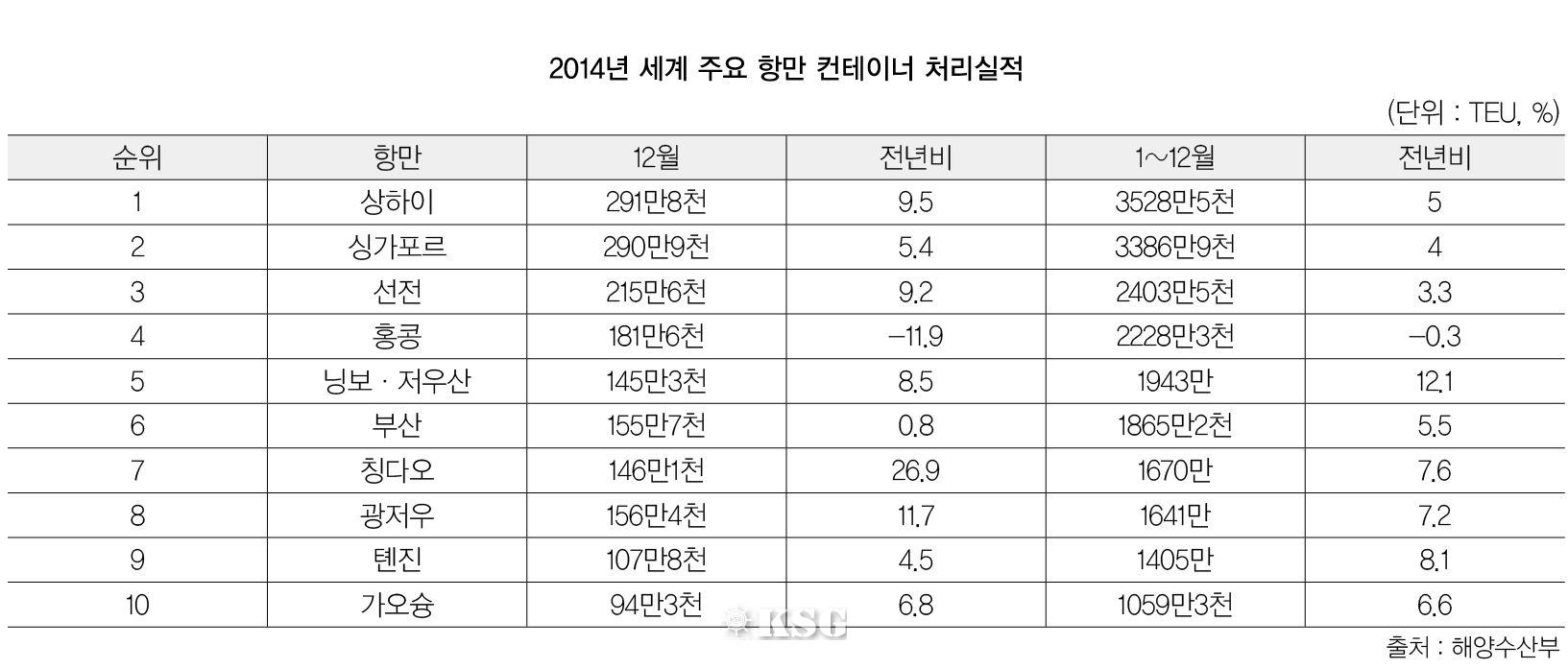 세계 10대 항만의 지난해 컨테이너 물동량은 전년 동기 대비 5.3% 증가한 2억1131만TEU를 기록했다. 세계 1위 상하이항은 지난해 보다 5% 증가한 3528만5천TEU를 처리하며 5년 연속 세계 1위 자리를 지켰다. 지난해 상하이항은 11월 처리실적을 제외하고 전년 동월 대비 모두 성장세를 보이며 세계 1위를 공고히 했다. 특히 2월과 6월에는 전년 대비 두자릿수 증가한 컨테이너 처리실적을 보이며 눈부신 성장을 일궜다.