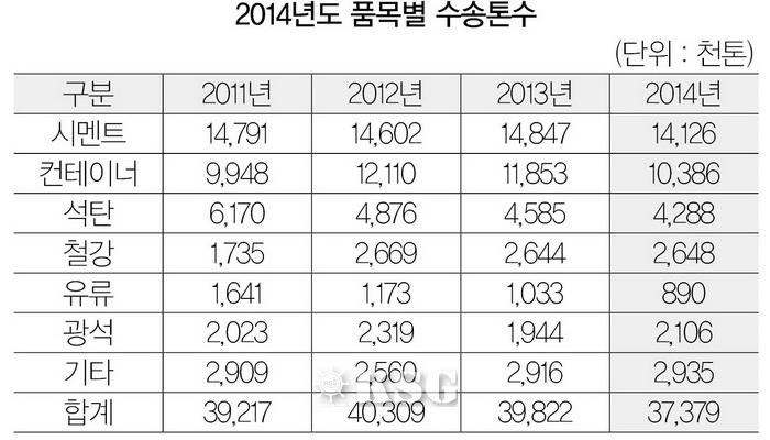 1년간 철도를 통해 수송된 품목별 수송톤수는 양회(시멘트)는 2014년 1년간 1412만6천t, 석탄은 428만8천t을 각각 기록했으며, 철강은 264만8천t으로 집계됐다. 석탄과 양회는 각각 전년대비 6.5%, 4.9% 감소했으며, 유류는 전년대비 -13.8%를 기록해 두 자릿수 이상 뒷걸음질 쳤다. 반면, 철강과 광석은 전년대비 0.2%, 8.3% 증가했다.