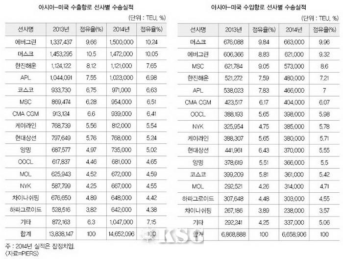 선사별 실적에선 에버그린의 약진이 돋보였다. 에버그린은 지난해 150만TEU의 물동량을 처리, 12%의 높은 성장세를 보이며 세계 1위 컨테이너선사인 머스크라인을 제치고 북미항로 최대 선사로 도약했다. 시장점유율은 2013년의 9.66%에서 10.24%로 끌어올렸다. 반면 머스크라인은 147만TEU로 증가세를 시현하는 덴 성공했지만 두 자릿수 성장곡선을 그린 대만 선사에 1위 자리를 내줬다. 시장점유율도 소폭 하락했다.
