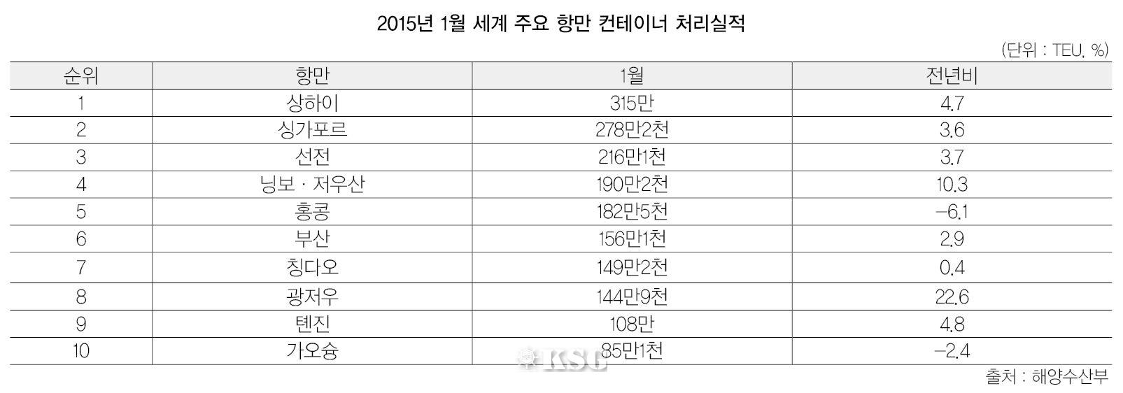 최근 해양수산부가 집계한 1월 세계 주요 항만 컨테이너 처리실적에 따르면 닝보·저우산항은 전년 대비 10.3% 성장한 190만2천TEU의 컨테이너 화물을 처리하며 월간 처리실적에서 세계 4위로 도약했다. 월간 컨테이너 처리실적에서 단 한번도 4위로 올라서지 못했던 닝보·저우산항은 광저우항에 이어 세계 주요 컨테이너 항만 중에서 높은 물동량 성장세를 보이며 사상 최초로 홍콩항을 눌렀다.