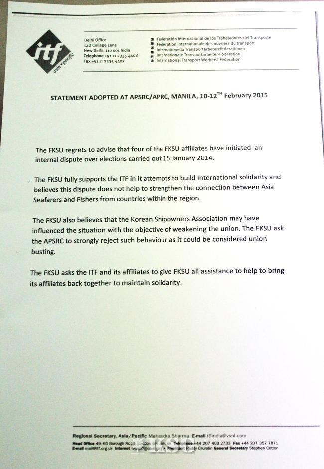 기자가 해상노련측에서 제시한 성명서 영문 사본을 확인한 결과 해당 문서는 마헨드라 샤르마 ITF 아태지역 사무소장 명의로 발급된 것이었다. 김혜경 국제본부장은 “해상노련은 ITF 회의에서 성명서를 제출할 생각이 없었지만 ITF 지역위원회에서 제의해 제출하게 된 것”이라며 “긴급동의안으로 제출된 안건을 기타사항으로 분류해 채택한 것”이라고 설명했다.