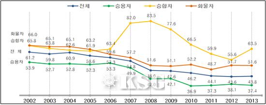 화물자동차 하루 평균 주행거리가 2002년에 비해 2013년 21.8% 감소한 것으로 나타났다.