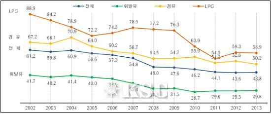 연료별로는 LPG가 2002년 88.9km에서 2013년 58.9km로 30km 감소했다. 경유는 2002년 67.2km에서 2013년 50.2km로 17km 감소했으며, 휘발유가 2002년 41.7km에서 2013년 29.8km로 11.9km 감소한 것으로 나타났다.