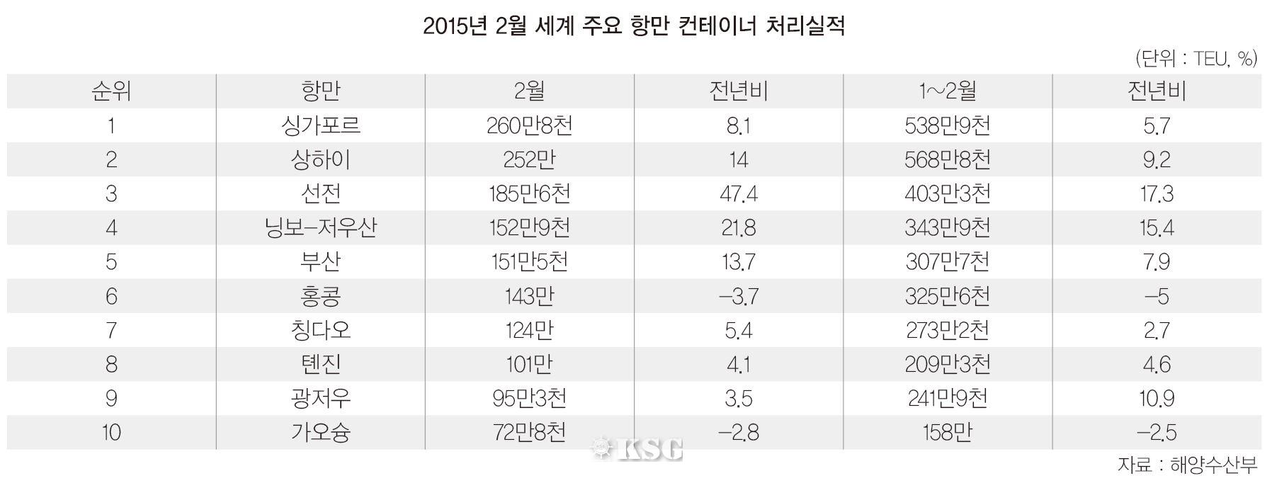 2월 월간 처리실적에서 부산항은 홍콩항을 약 8만5천TEU로 앞서며 세계 5위에 올라섰다. 현재 홍콩항과 부산항의 누계 물동량 격차는 약 18만TEU에 불과하다. 물동량 하락세를 보이고 있는 홍콩항과 달리 부산항은 1월과 2월 월간 실적에서 각각 2.9% 13.7%의 성장율을 보였다.