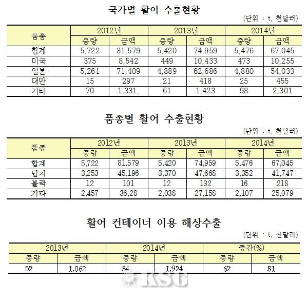 연간 활어 수출물량은 5500t, 7500만달러 안팎으로, 지난해 실적은 일본 4880t(5403만달러) 미국 473t(1026만달러) 대만 25t(46만달러) 순이었다. 이 가운데 컨테이너를 통한 해상수출은 62% 늘어난 84t이었다.