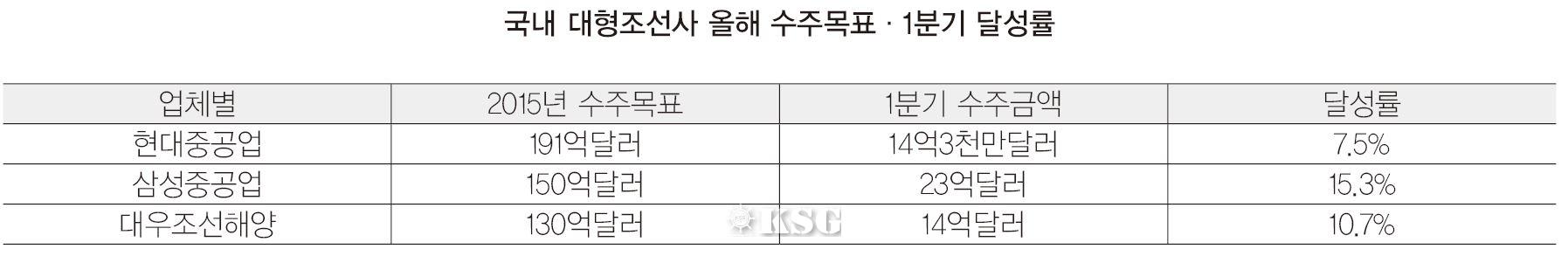 현대중공업은 올해 유조선 수주 비율이 다른 선종에 비해 압도적으로 높다. 지난해 1분기까지 컨테이너선, LNG선, 드릴선, 특수선, 벌크선 등 여러 선종에서 수주를 했던 모습과는 대조적이다. 고르지 못한 수주 때문이었는지 실적에서도 지난해와 큰 차이를 보였다. 2014년 1분기까지 현대중공업의 신조선 수주금액은 전년 대비 14% 감소한 59억달러를 기록했지만 올해는 1년 전에 비해 80%나 급감한 6억3600만달러로 집계됐다. 3월 말 기준 현대중공업의 수주 잔량은 전년 대비 27% 감소한 171억달러였으며 척수는 33척 감소했다. 수주 잔량 선종별 비중은 LNG선 26%, LPG선 17%, 탱커 16%, 컨테이너선 13%, 특수선 12%, 반잠수정시추장비 8%, 드릴선 3%, 벌크선 3%, 기타 2%다.