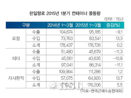 한국근해수송협의회에 따르면 한일항로 1분기 물동량은 44만1246TEU로, 지난해 같은 기간의 44만2547TEU에 비해 1301TEU 감소했다. 백분율로 따져 0.3%의 소폭 하락세다. 수출화물 감소 폭이 수입화물 증가 폭을 웃돌며 전체 물동량 하락세로 이어졌다.